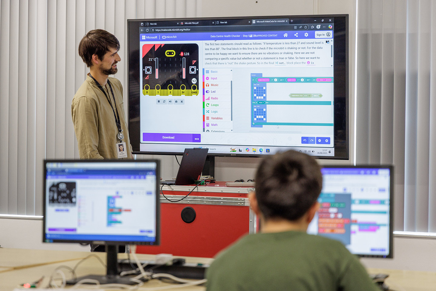 During the school summer holidays this year, the team ran a pilot event at the Cambridge Centre for Computing History for children of different ages and experience levels. The young coders tried various activities, including a sound-level indicator. The team linked this lively challenge to real data centres, which can be extremely noisy. Children used the micro:bit’s built-in microphone to measure sound levels, which are displayed using numbers between 0 and 255. They roamed the classroom testing sounds, which ranged from quiet chatter (17–30) to banging a wall near a fan (120).