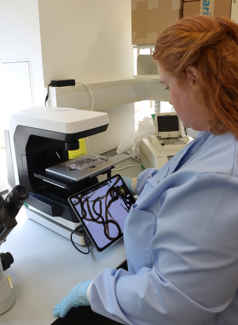 In the last few years, new technologies have emerged that allow large scale, high-throughput spatial at greater resolution. Now, you can have probes right next to each other. As part of their work, Sarah was using the spatial technology Curio on these worms for the first time. Curio slides are typically 3 millimetres by 3 millimetres and these worms are approximately 500 microns by 25 centimetres. Most of the drug resistance and susceptibility targets are in the neurons located in the head of these worms. Therefore, Sarah was taking the first 3 millimetres and packing loads of them in one slide.
